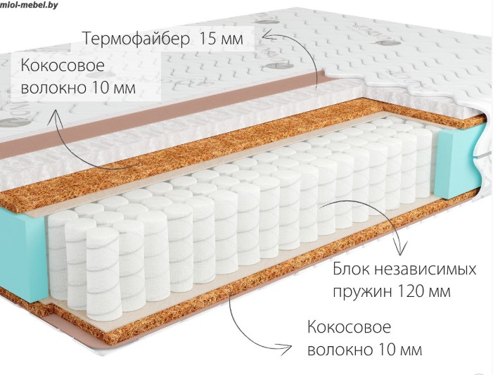 Основа матраса: блок независимых пружин Medio, высота 140 мм Количество пружин на спальное место: 520 шт. Настил матраса (верхняя сторона): термофайбер 15 мм Настил матраса (нижняя сторона): термофайбер 15 мм Ткань матрасного чехла: трикотажная, жаккардовая Срок гарантии: 36 месяцев Срок службы: 10 лет