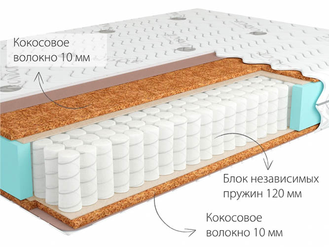 Жесткий матрас с блоком независимых пружин и кокосовым волокном.