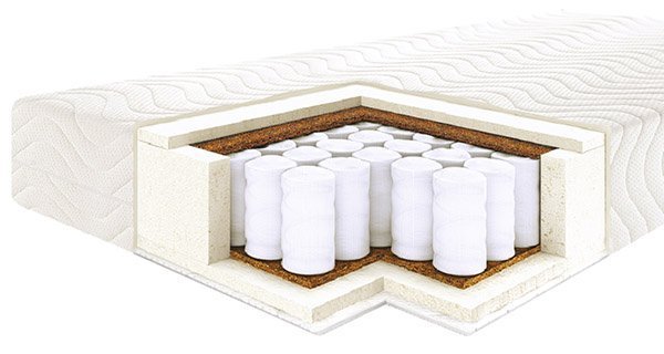 Матрас высотой 22 см со слоями латекса, кокоса и блоком независимых пружин.