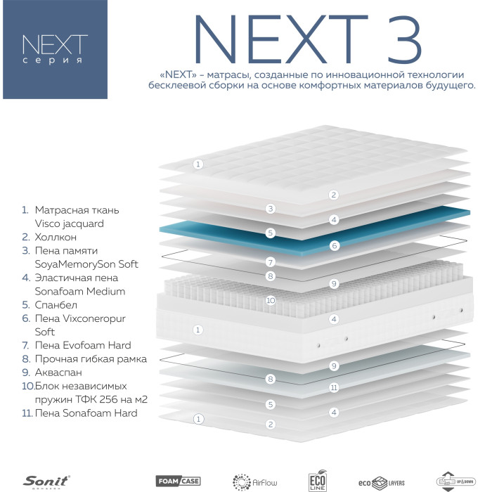 Независимый пружинный блок с двумя зонами разной жесткости. Высота матраса: 18 см.