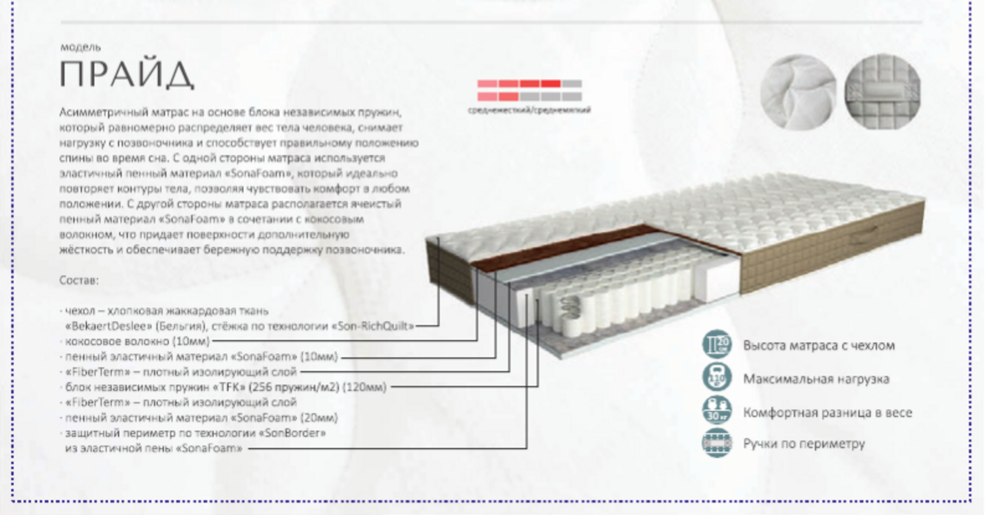 - Чехол – хлопкосодержащая жаккардовая / трикотажная ткань «BekaertDeslee» (Бельгия), стёжка по технологии «Son-RichQuilt»