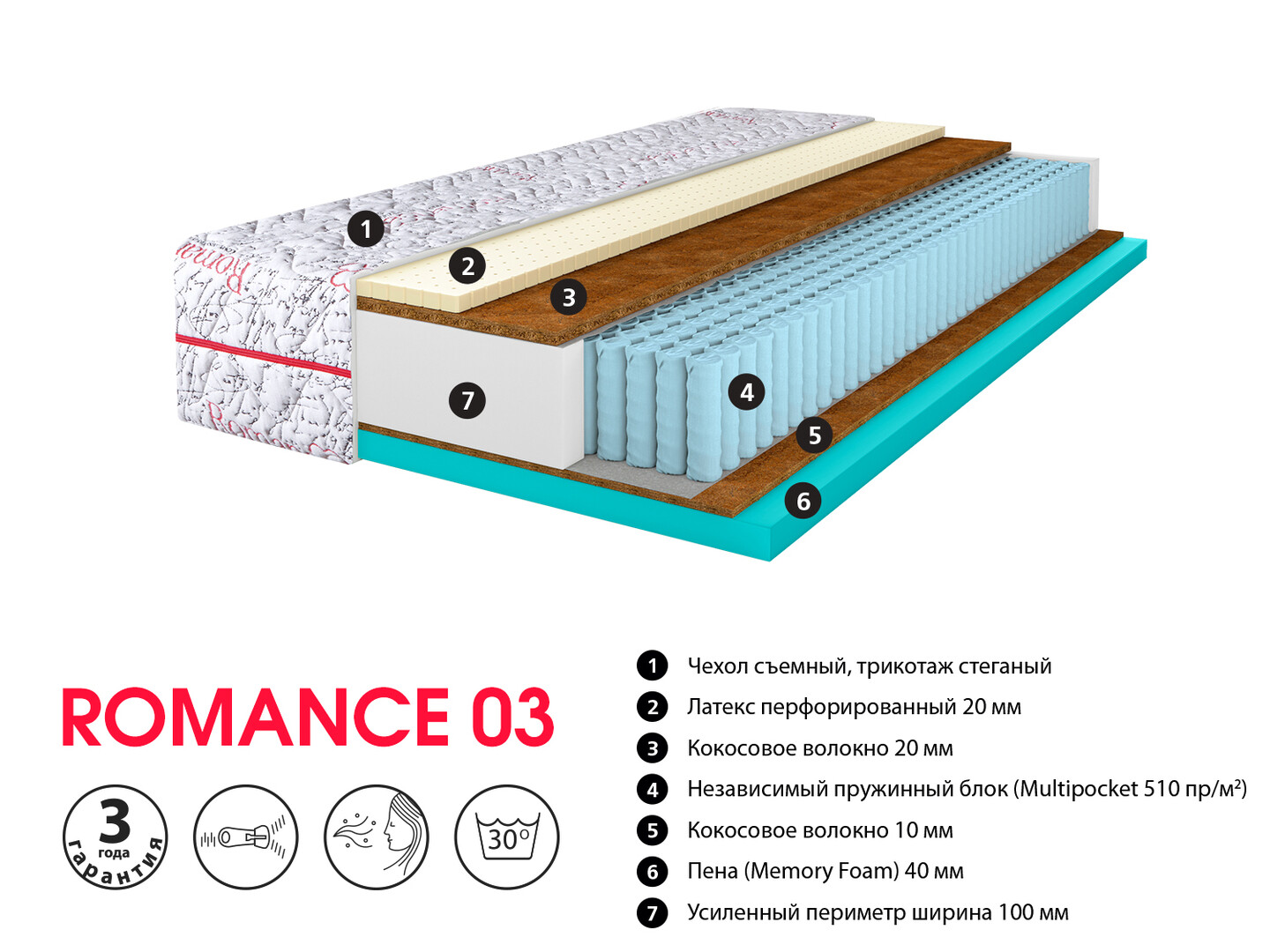 Материал: латекс, кокосовое волокно, пена Меmory Foam, усиленный периметр ширина 100 мм
