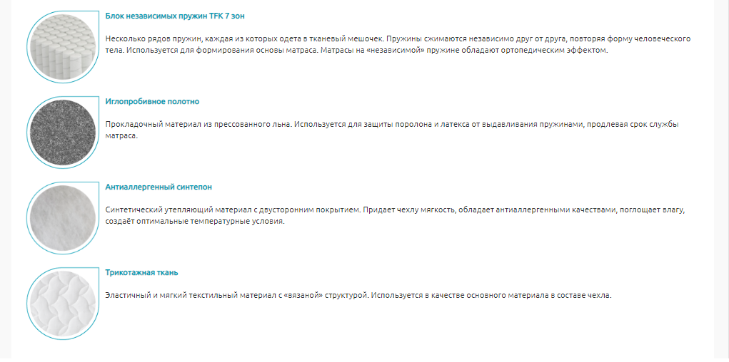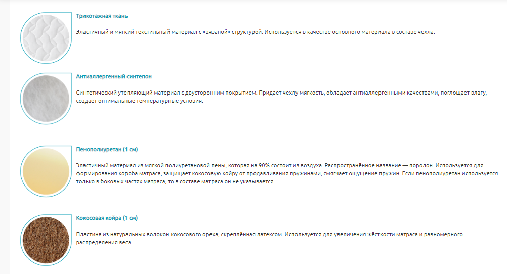 Слои матраса: пенополиуретан, кокос, иглопробивное полотно