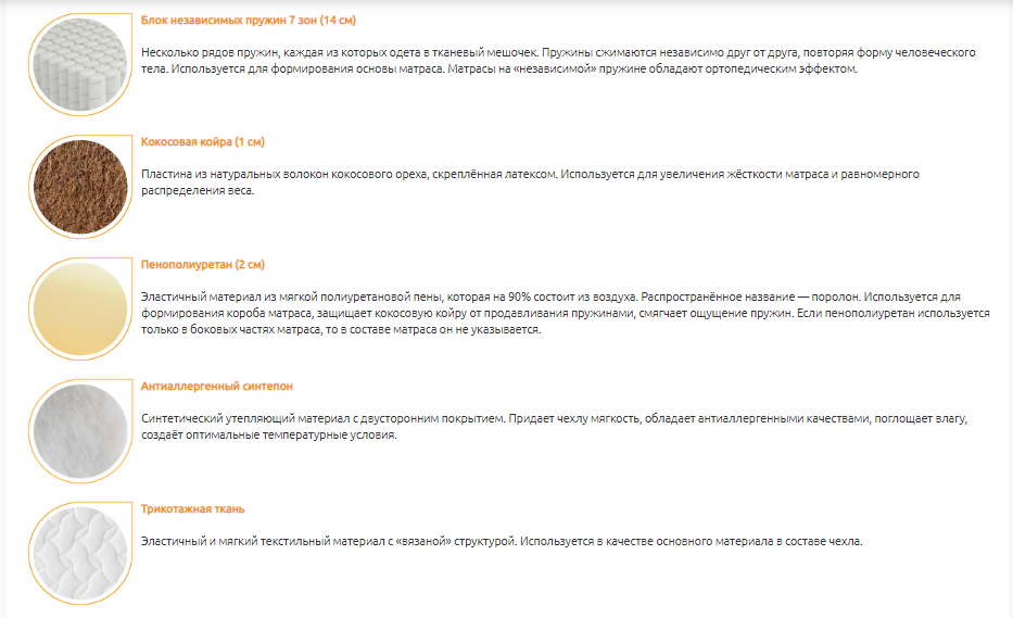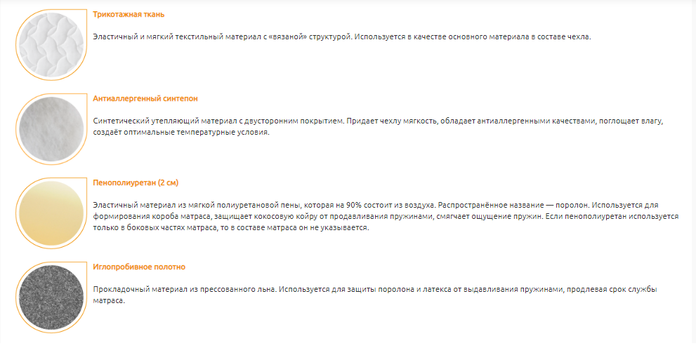 Слои матраса: пенополиуретан, кокосовая койра