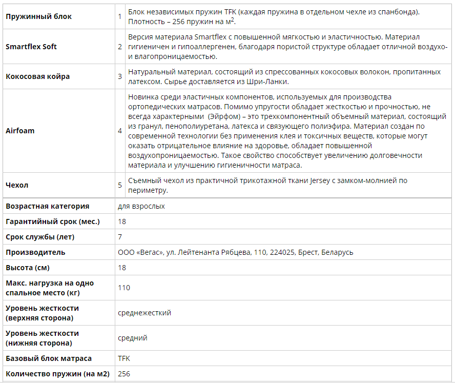 Высота матраса: 17 см. Жесткость: средней жесткости.