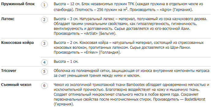 Независимый пружинный блок с двумя зонами разной жесткости. Высота матраса: 18 см.
