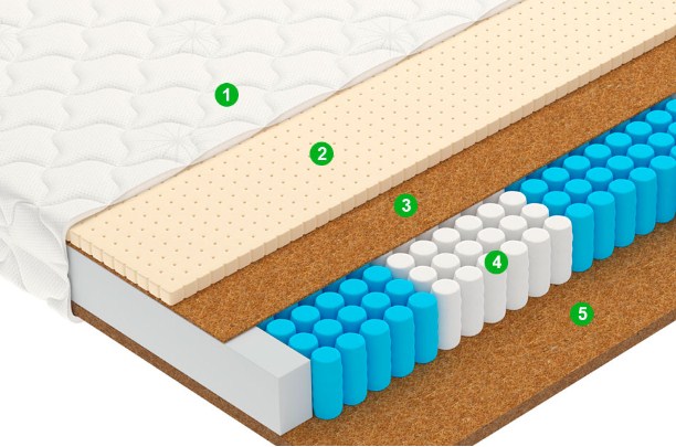 Матрас среднежесткий, внутри блок независимых пружин, кокосовое волокно и термофайбер.