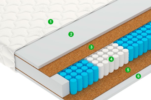 Мягкий матрас со слоями кокоса и латекса. Блок независимых пружин.