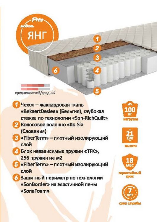 Ортопедический матрас на основе блока независимых пружин "TFK" (256 пружин на м2), выполняющий функцию правильной поддержки позвоночника во время сна. Матрас равномерно распределяет вес тела человека, снимает нагрузку с позвоночника и способствует правильному положению спины во время сна.