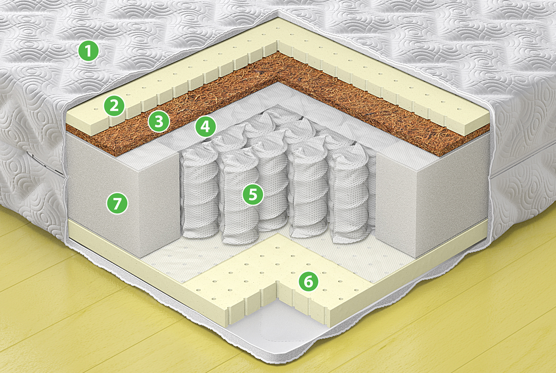 - Кокосовое волокно - натуральный наполнитель из спрессованных кокосовых волокон, придает жесткость и делает матрац упругим.