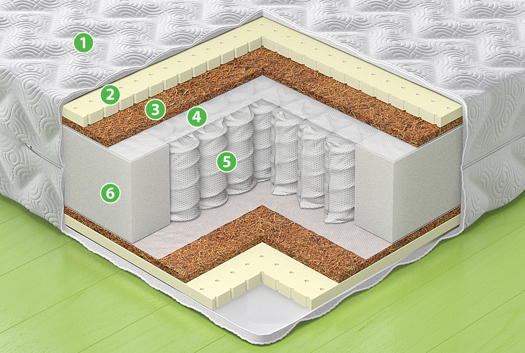 - Кокосовое волокно. Натуральный наполнитель из спрессованных кокосовых волокон. Придает жесткость матрасу и делает его более упругим.