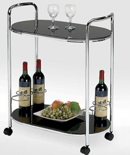 Удобный сервировочный столик с двумя столешницами и хромированными кольцами для бутылок с напитками.