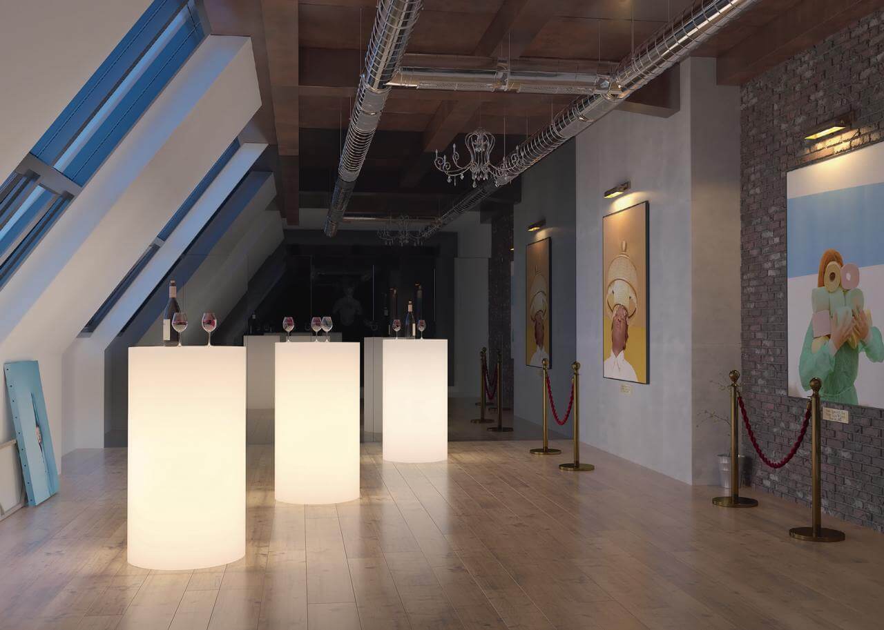 Фуршетный стол Alto с подсветкой оснащен светодиодным элементом, который дает статичную белую LED-подсветку или разноцветную RGB-подсветку с регулировкой пультом дистанционного управления. Функциональность свечения зависит от модели и влияет на конечную стоимость товара.