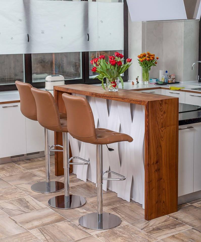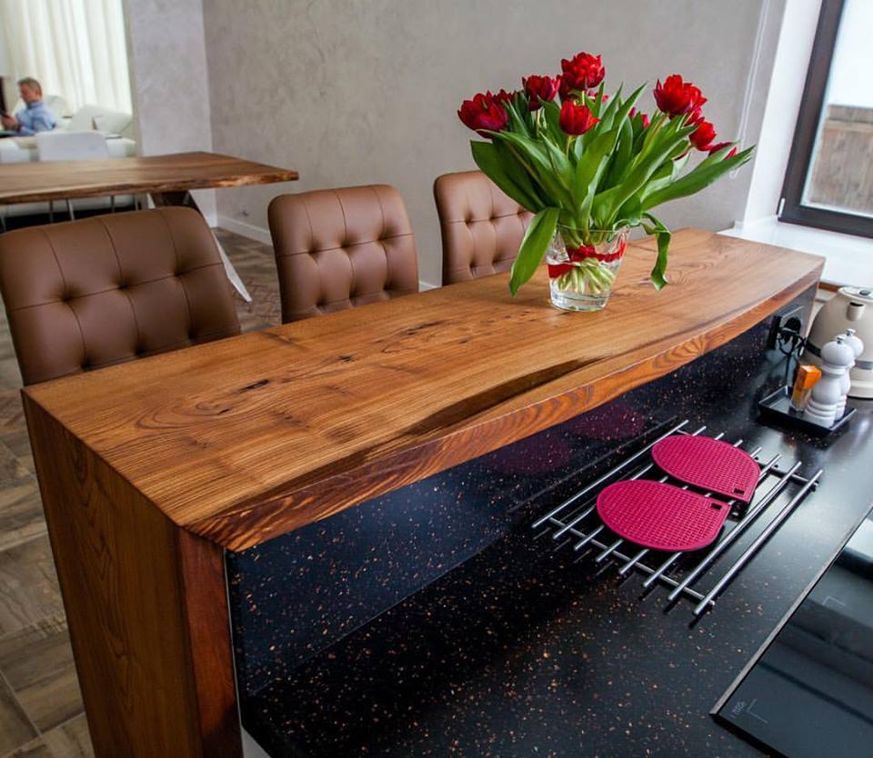 Яркая и теплая текстура натурального дерева столешницы и торцов. Оригинальный дизайнерский подход.