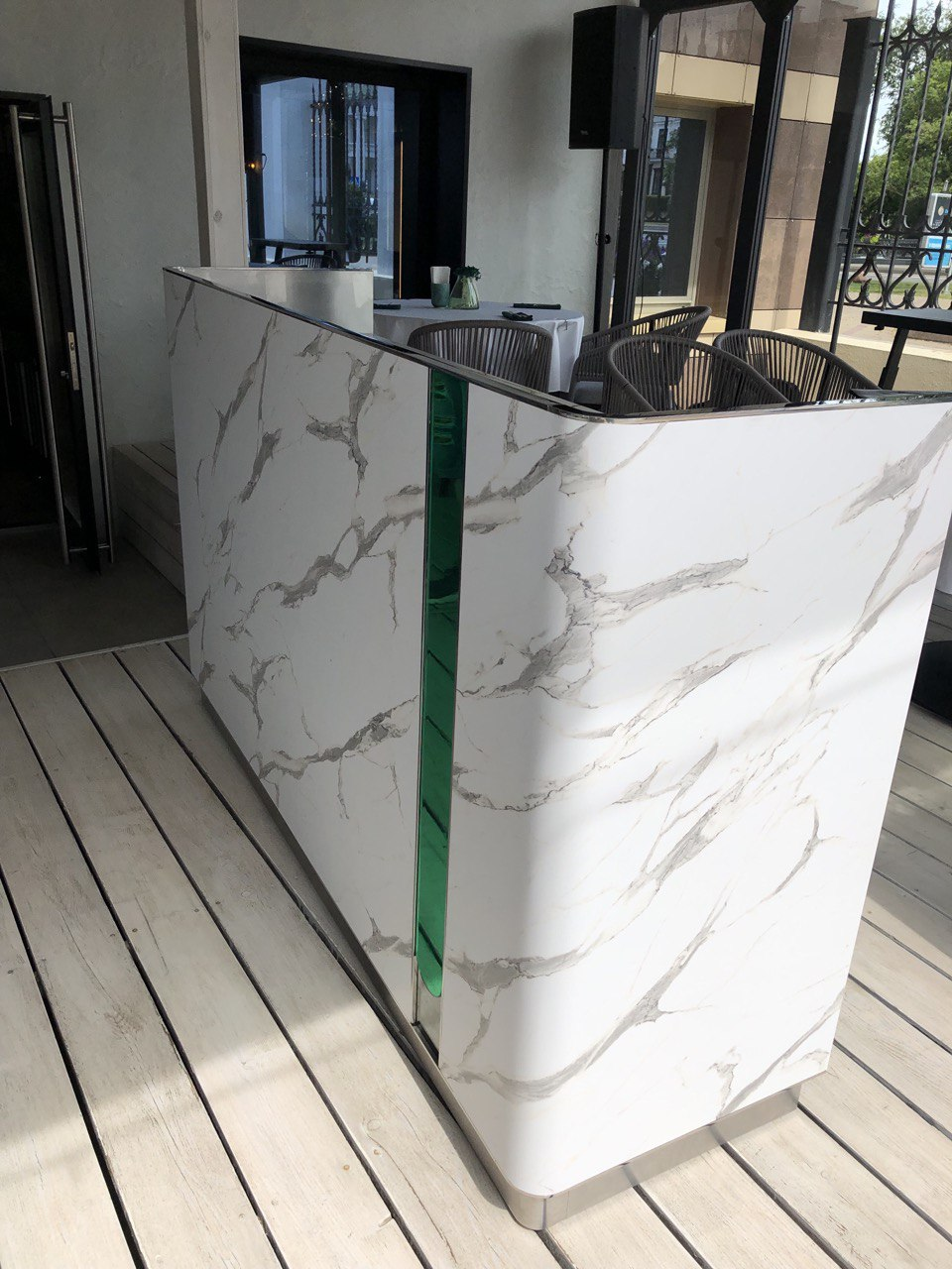 код 128743Глянцевая столешница у стойки. Декоративная вставка зеленого цвета.