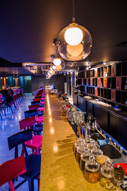 Главный элемент мебели для кафе расположен за барной шкаф, созданный с использованием итальянских фасадов из массива и стильной европейской фурнитуры. Необычная отделку дверц шкафа и весь дизайн в целом придают облику бара респектабельность, а с другой стороны, демонстрируют современность и динамику атмосферы данного заведения. Безупречная линия полок создает впечатление гармонии и демонстрирует высокое качество исполнения представленной мебели.