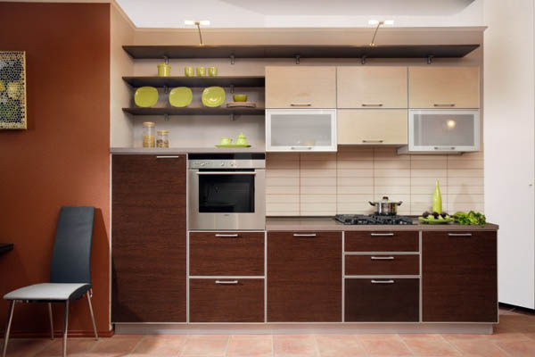 Линейный кухонный гарнитур с салатовым нижним фасадом и оранжевыми дверцами навесных шкафов.