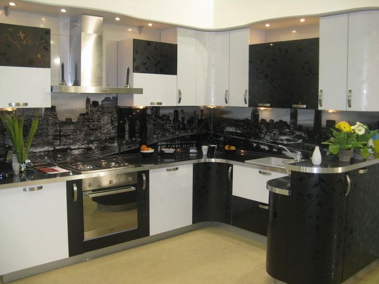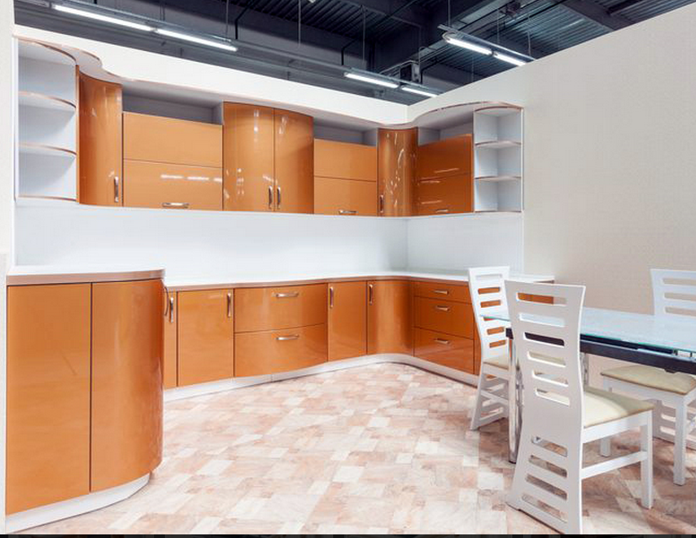 Красно-оранжевый цвет фасада. Скинали с фотопечатью.