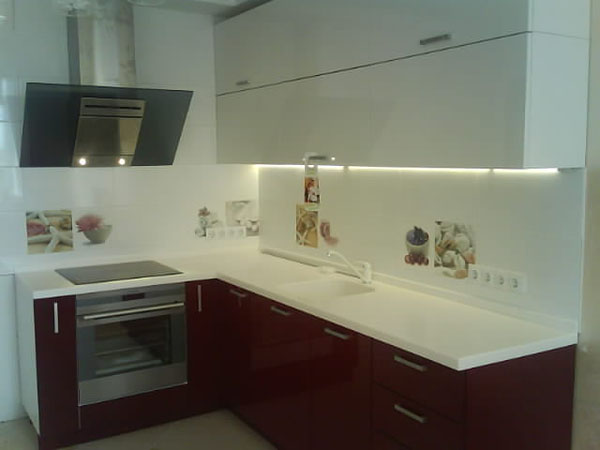 Стеклянные витражные вставки. Столешница и портал для вытяжки в белом цвете.