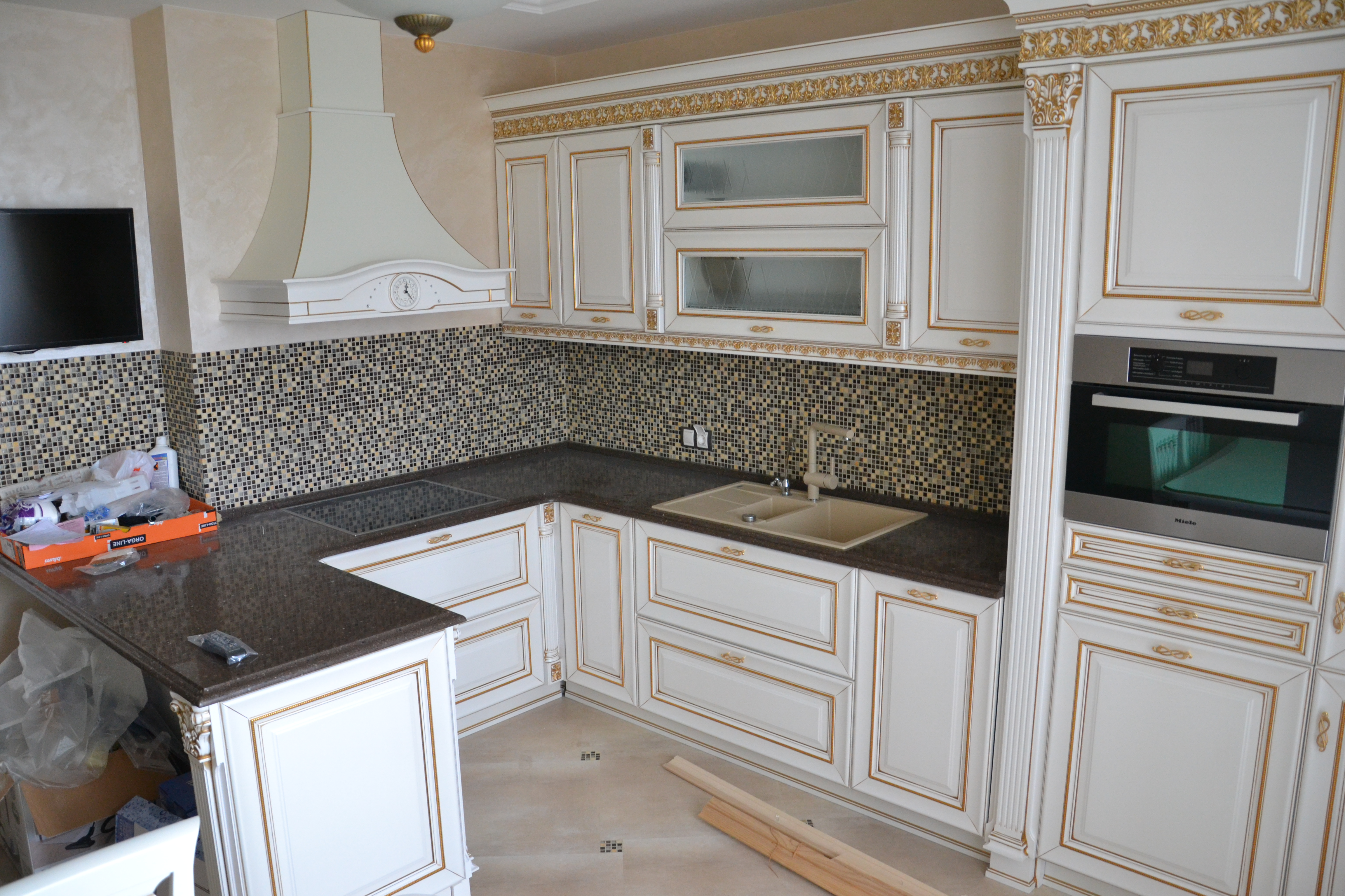 Белые резные фасады с позолотой, темная каменная столешница. Г-образная кухня со стойкой.