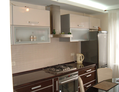 J-образная кухня. Сочетание на фасадах венге и бежевой эмали.