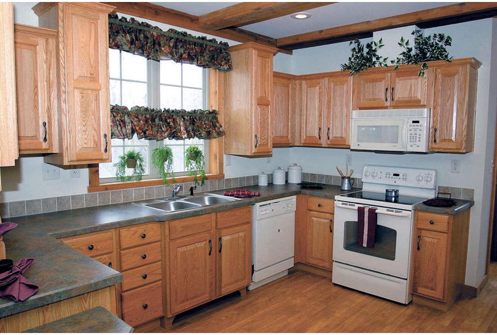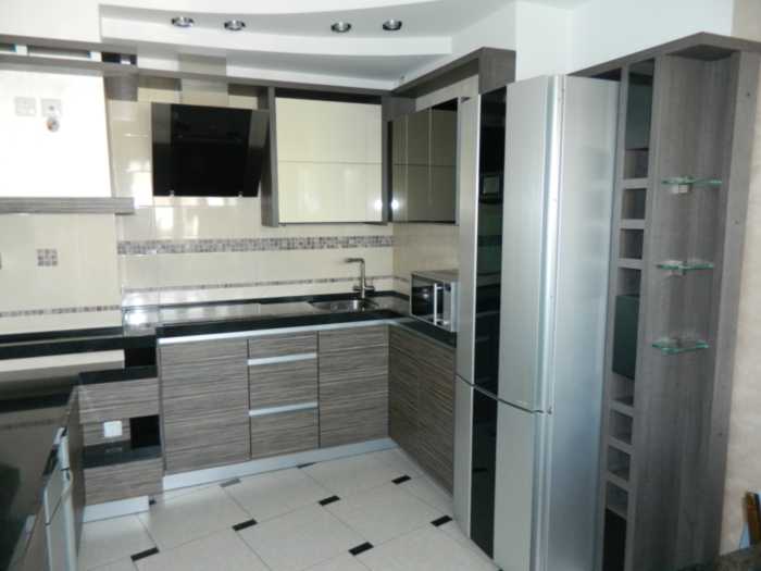 Стильный кухонный гарнитур с фактурой светлой древесины на фасаде. Две ниши остеклены лакоматом.