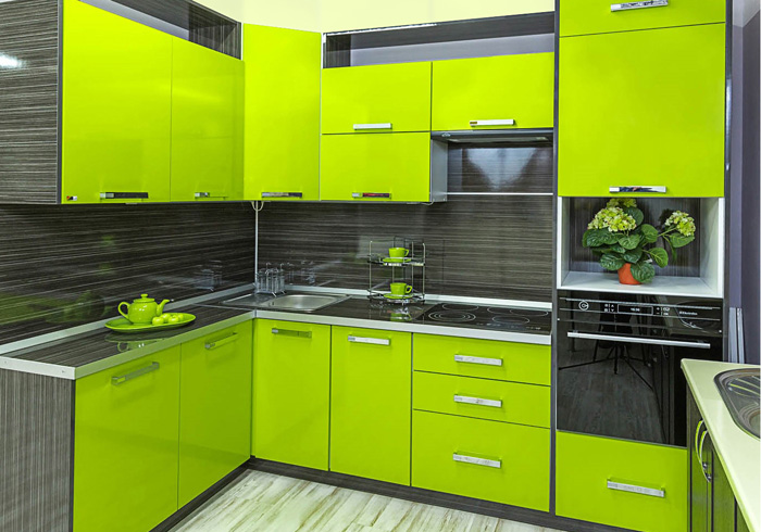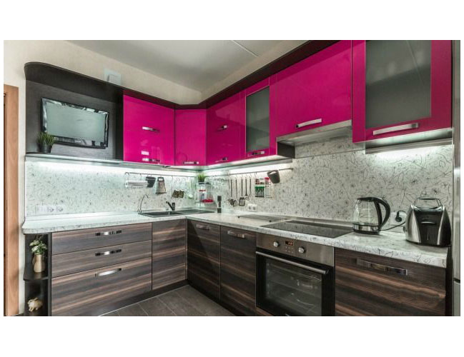 Яркий угловой гарнитур для большого помещения. Козырек с подсветкой.