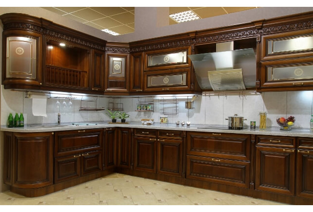 Фасад с карнизами и резьбой, с позолоченными ручками.