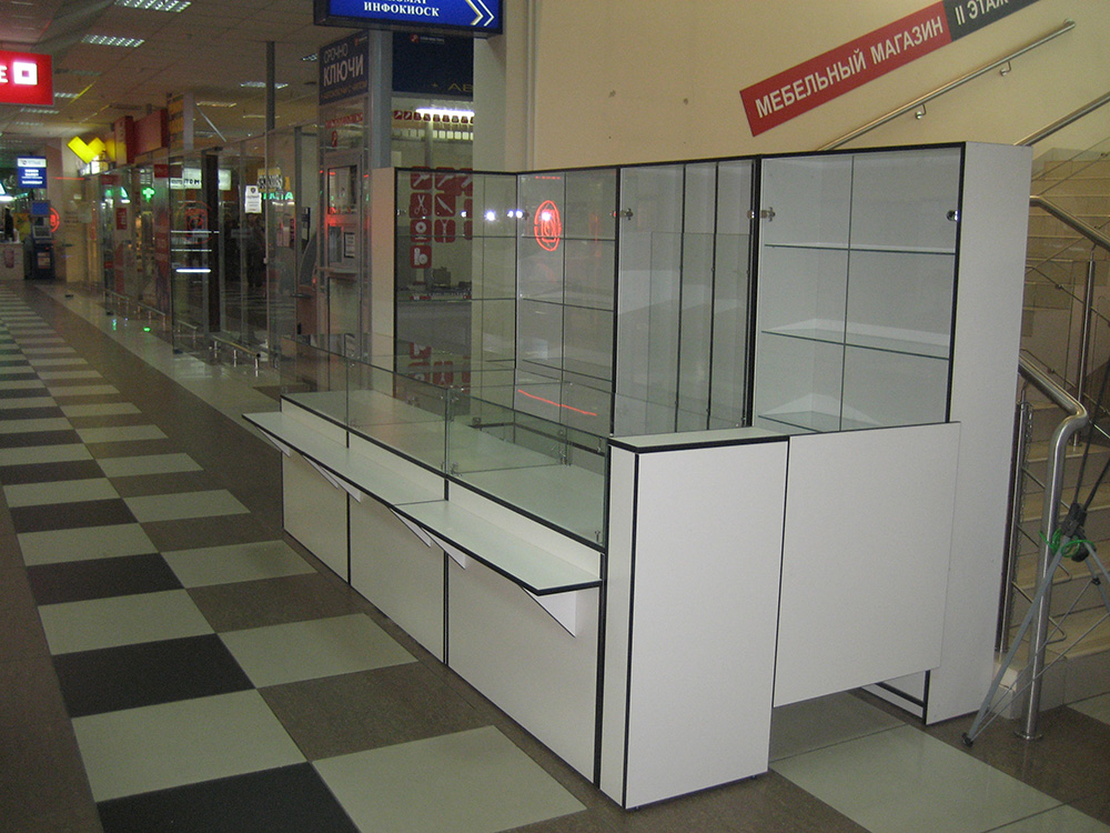 код 47581Застекленные стеллажи со стеклянными полками. Дополнительные полки для покупателей.