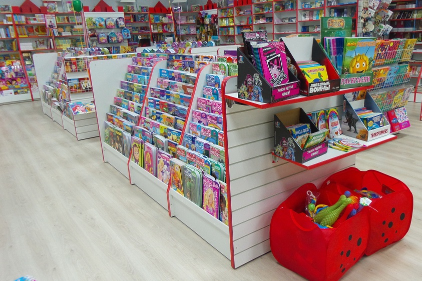 Стеллажи для магазина выполнены в ярком запоминающемся стиле. Конструкции исполнены в сочетании белых фасадов, красных и желтых стендов. Модель обладает большим количеством открытых полок, удобных для продукции различного назначения.