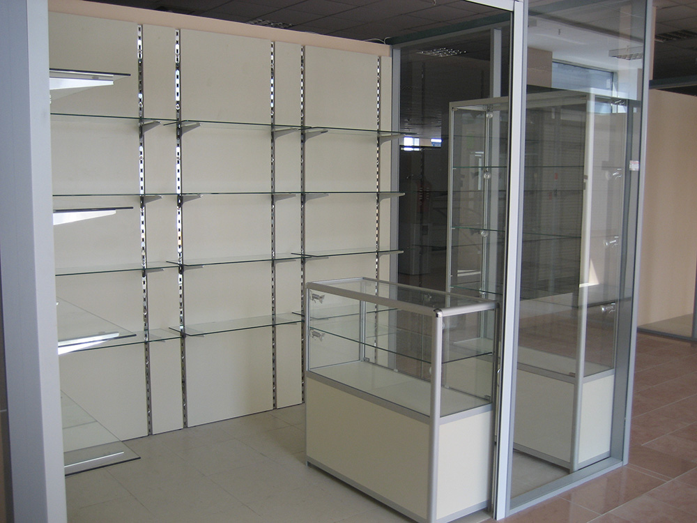 Стеклянные стеллажи для магазина удобны не только потому, что приятно выглядят, но и потому, что позволяют оценить товар со всех сторон еще на своей полке. Набор для магазина может включать в себя ещё и стеклянные витрины.