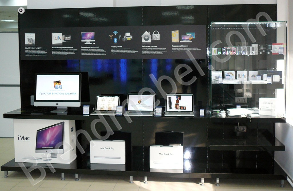 Черный глянцевый цвет стеллажа придает ему современный и элегантный вид. Прозрачная витрина с трех сторон позволяет покупателям легко рассмотреть представленные товары.