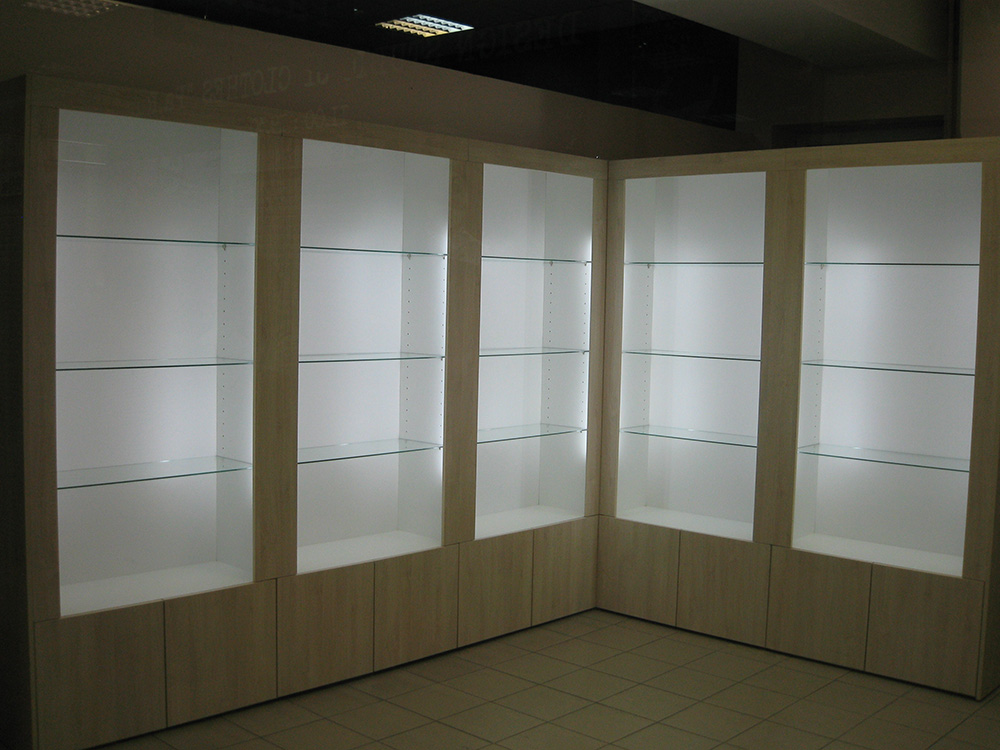 Стеллажи для магазина уже сами по себе могут служить украшением интерьера. Стеклянные полки придают конструкции современный внешний вид, а декоративная подсветка ещё и наполняет стеллаж светом. Корпус может быть выполнен в различных цветовых вариациях.