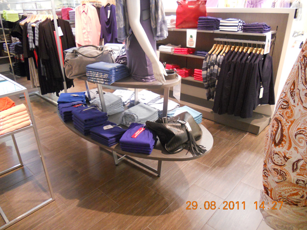Овальная стойка для одежды двухэтажня. Помимо одежды, для украшения интерьера, на нее можно поставить манекена. Стойка удобная и прочная, что очень хорошо для больших магазинов.