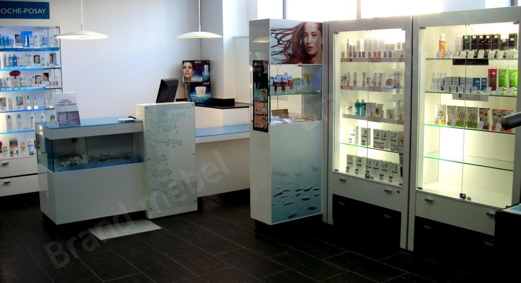 Предлагаем широкий ассортимент торгового оборудования для аптек, включая мебель с белыми фасадами и принтом, стеклянные полки и другие элементы, необходимые для эффективного размещения и продажи медикаментов, товаров оптики и продукции «зеленых» аптек.