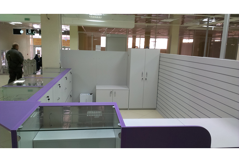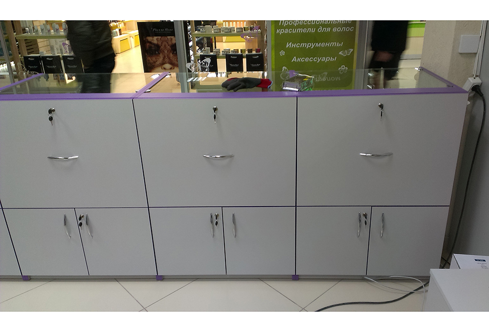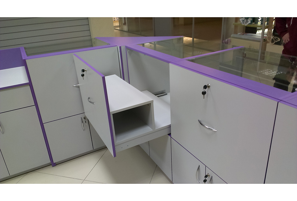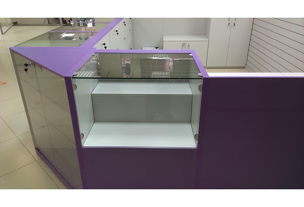 Торговая витрина выполнена в современном дизайне с применением фиолетового цвета в декорировании фасада. Витрины запорные, с надежным и прочным стеклом. Ящики для наполнения витрин под ключ, выкрашены в светлый серый цвет с дугообразными металлическими ручками. Внутри витрины предусмотрена дополнительная ступенька для товара.