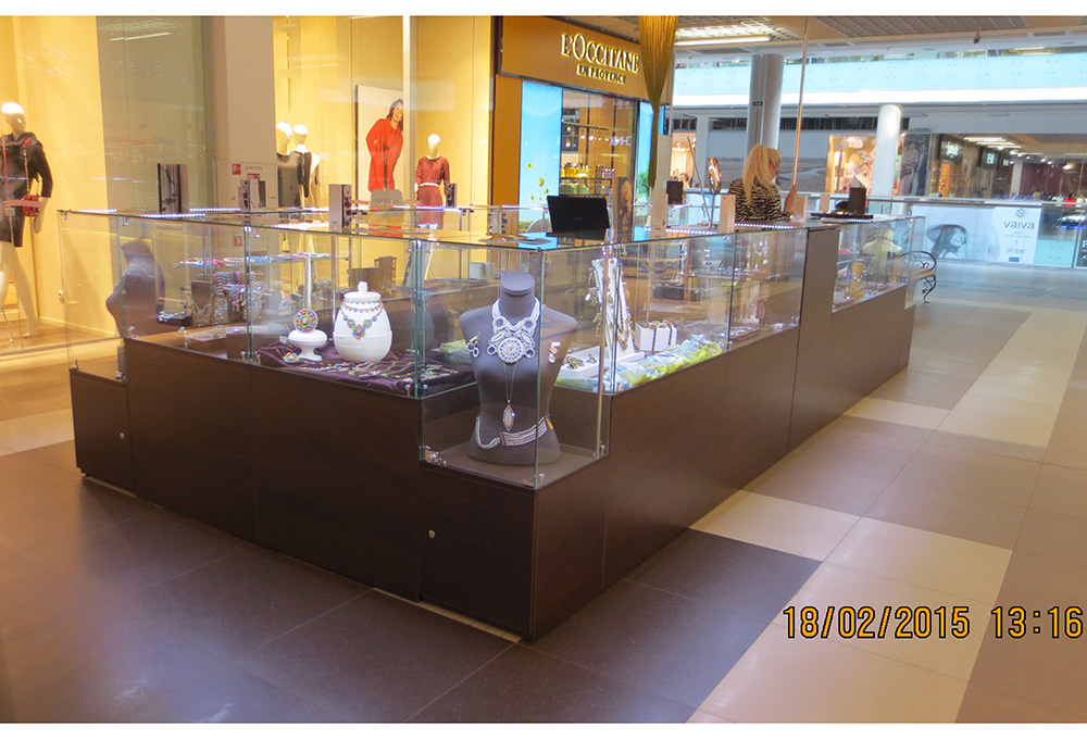 Представленный торговый островок выполнен в темно-коричневом корпусе. По периметру модели расположена стеклянная витрина. Гарнитур имеет функциональную внутреннюю подсветку.
