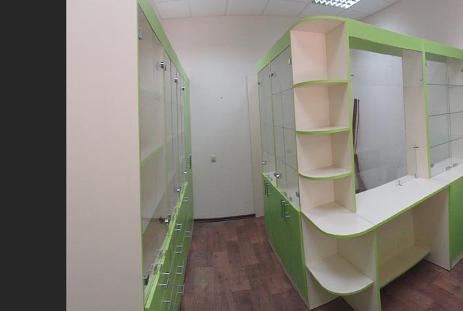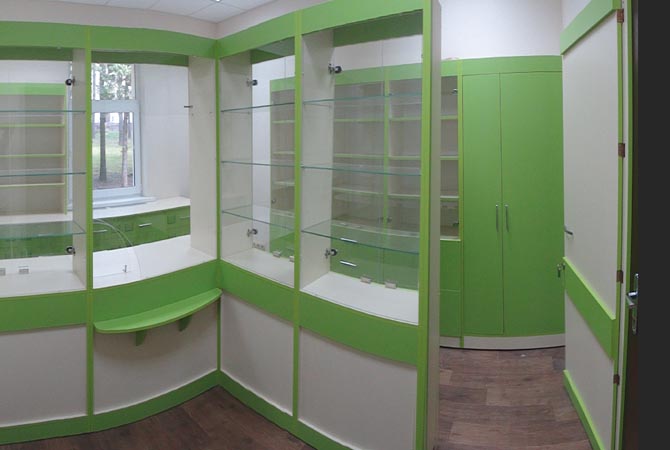 Угловая застекленная витрина с бело-зеленым корпусом подойдет для аптеки или небольшого магазина. Конструкция имеет безопасное кассовое окошко с прочной прозрачной перегородкой и удобную полочку для сумок покупателей. Витрина имеет большое рабочее пространство для кассового аппарата и документов.