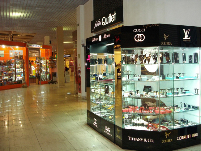Полукруглая форма застекленной витрины смотрится необычно и современно. Фасады витрины черные глянцевые и на каждом участке нанесен логотип бренда с внутренней подсветкой. Последнее позволит обратить внимание клиентов именно на ваш товар.