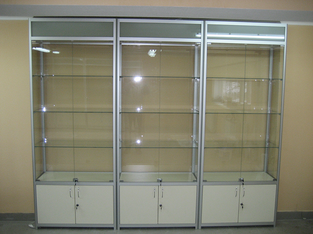 Представленная витрина оснащена встроенной декоративной подсветкой в верхней части конструкции. На пластиковый фасад может быть нанесен логотип магазина или торговой марки. Высокие стеклянные створки закрываются на замок. Конструкция оборудована стеклянными створками.