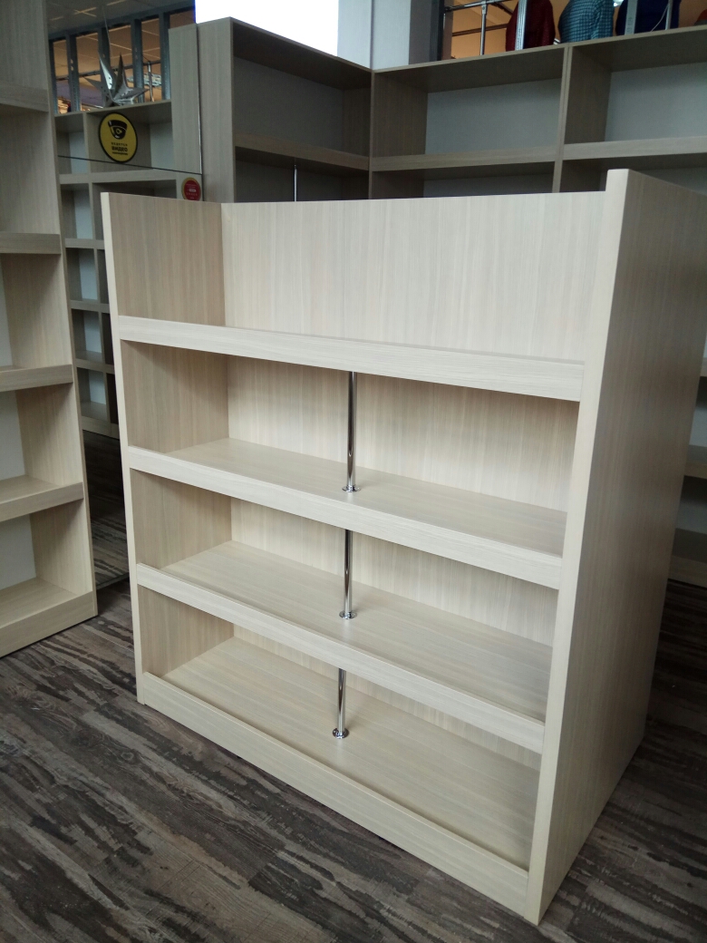 Небольшая витрина из ЛДСП светлого древесного оттенка изготовлена под заказ для торгового объекта. Наполнение представлено четырьмя открытыми полками, три из которых посередине разделены металлическими стойками.