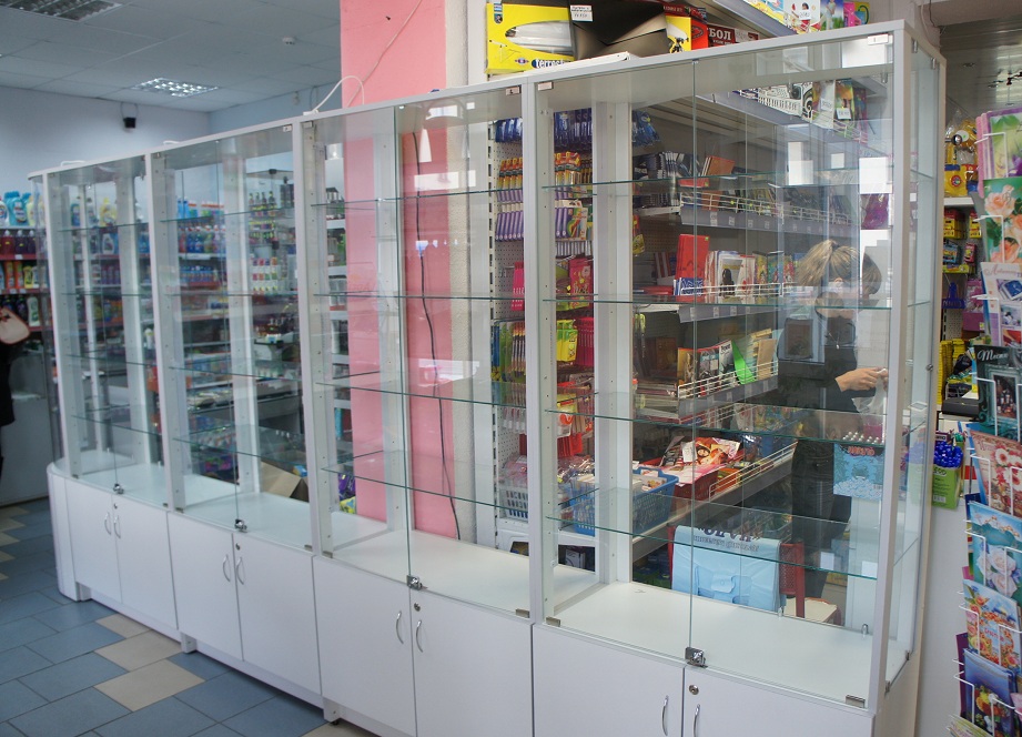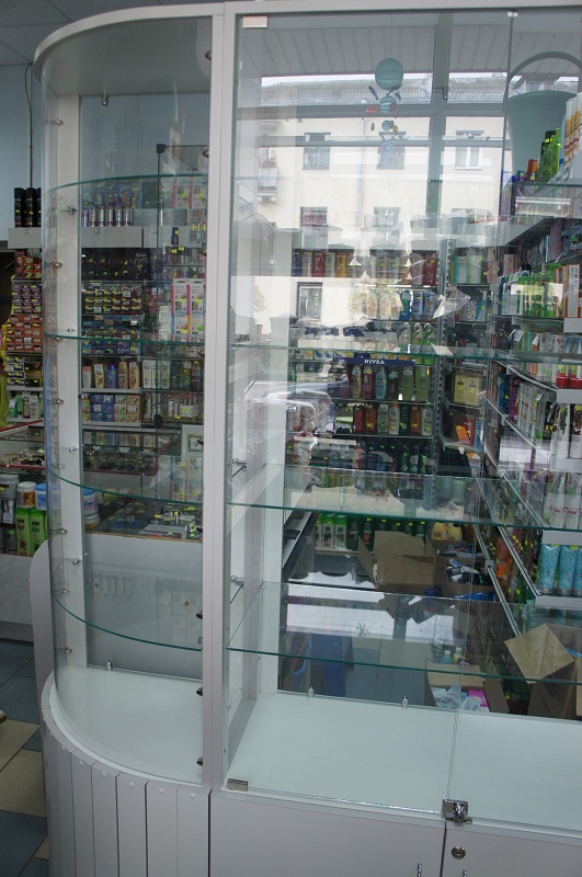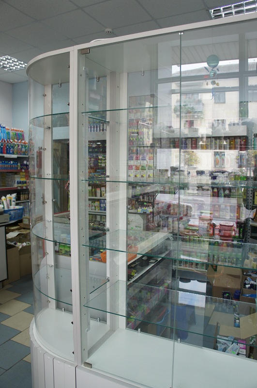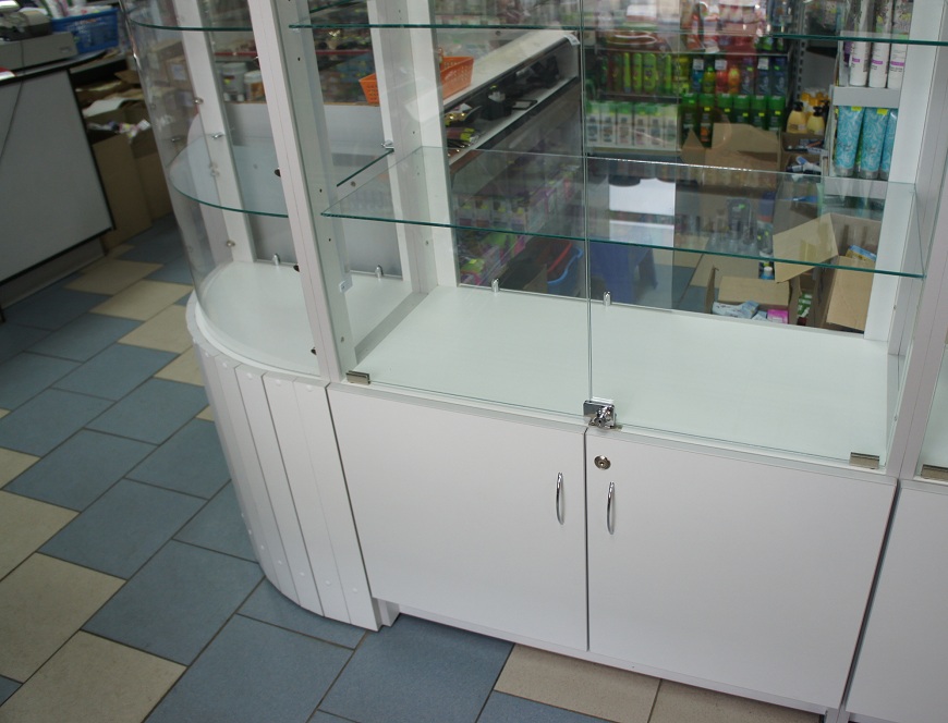 Вертикальная витрина с радиусными полками подойдет для обустройства косметического магазина. Корпус изделия окрашен в белый цвет. Модель оборудована вместительными накопителями, которые комплектуются надежными замками.