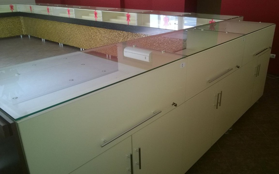 Четырехсторонние прозрачные витрины. Панели для навески люстр.