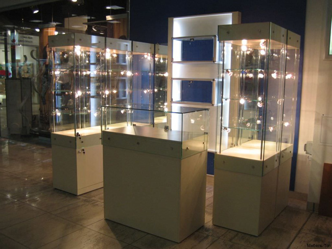 Высокие стеклянные витрины способны украсить не только помещение магазина, но и привлекут внимание покупателей в большом торговом центре. Стеклянная часть изделия установлена на подставки светлого цвета.