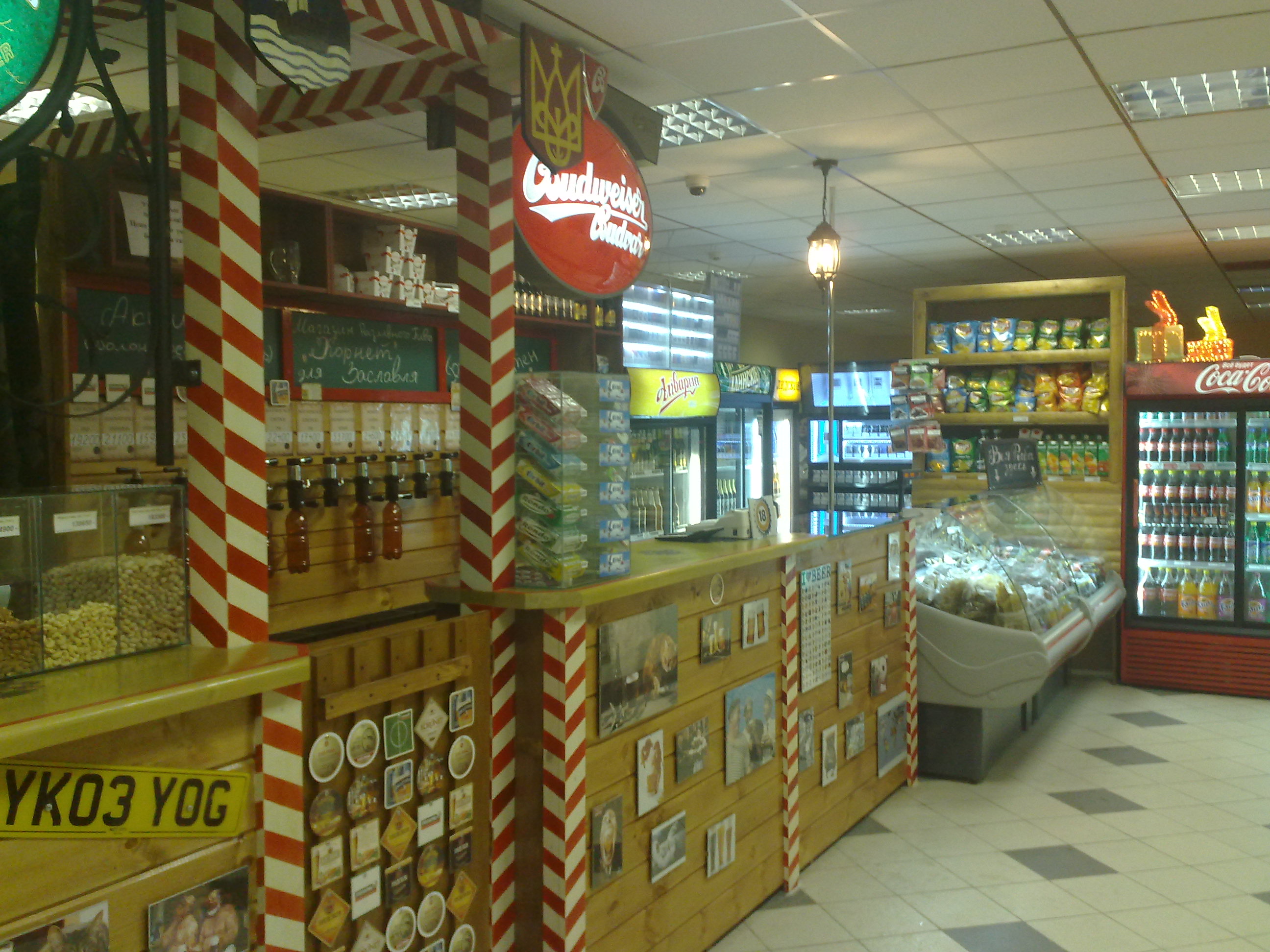 Яркая и красочная стойка из массива для алкогольной секции магазина или кафе. Стойки и стелажи обильно отделаны лакировнным деревом и дополняются аркой и другими балочными элементами, окрашенными под цвет дорожной красно-белой заградительной ленты. Данный интерьер погружает в атмосферу колоритного паба или придорожного бара, которые мы так привыкли видеть в голливудских фильмах.