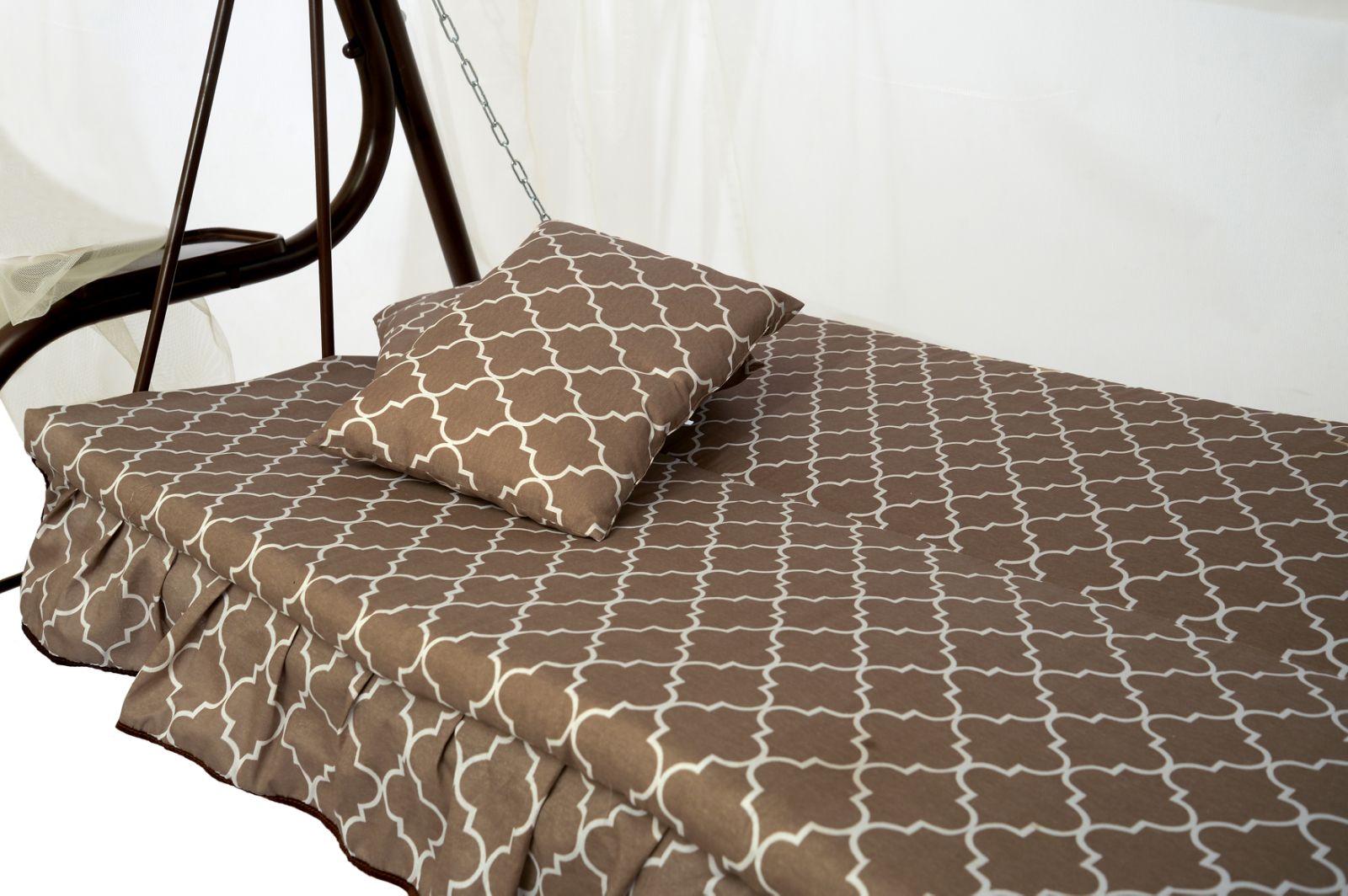 Мягкий элемент: ткань 45% п/э – 55% хлопок, плотность 120-130г/м2, наполнитель мягкого элемента (листовой поролон 50мм), наполнитель подушек (крошка поролона). Подушки – 2шт.