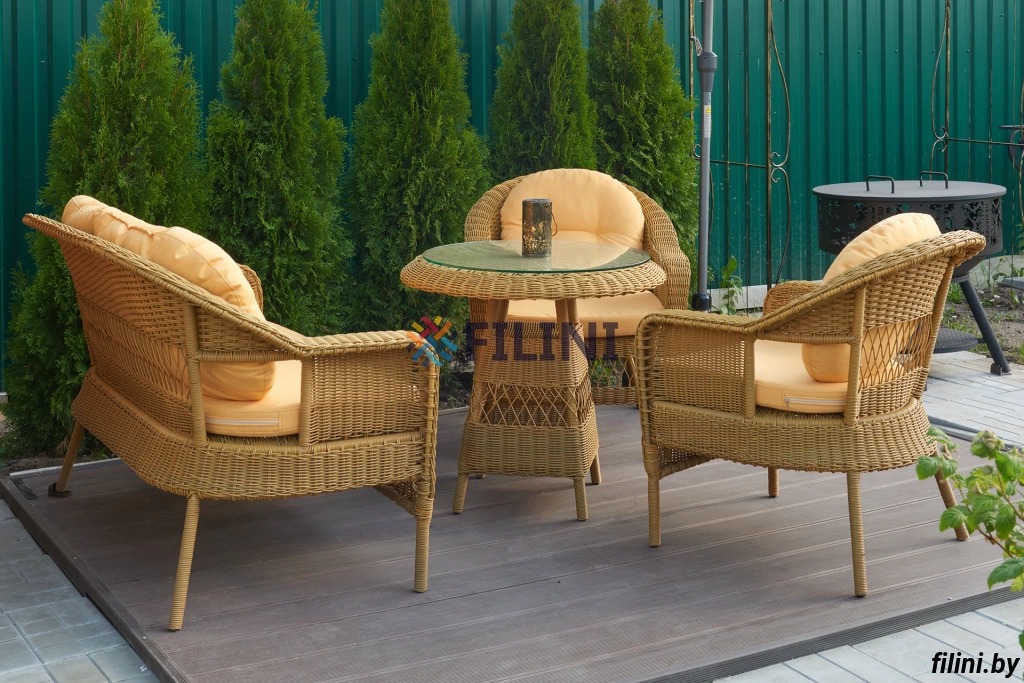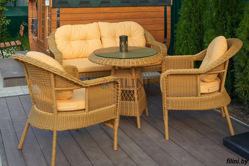- искусственный ротанг собственного производства устойчив к длительному воздействию атмосферных осадков и ультрафиолета, резкому перепаду температур, не подвержен плесени и со временем не выцветает на солнце, легок в уходе;