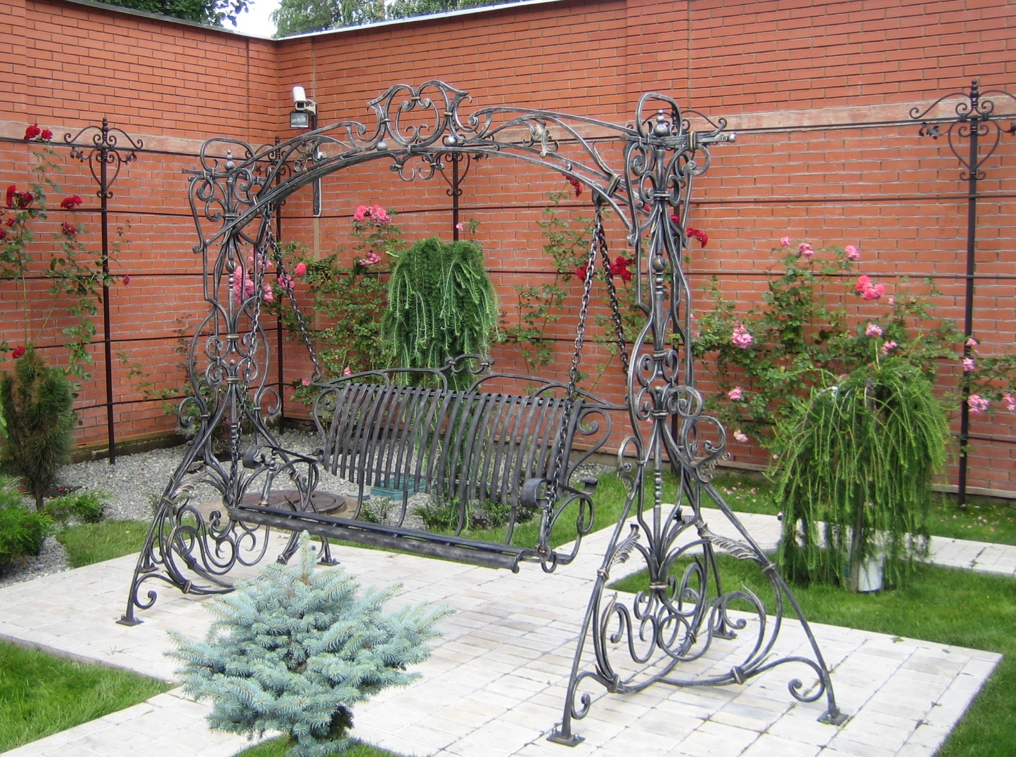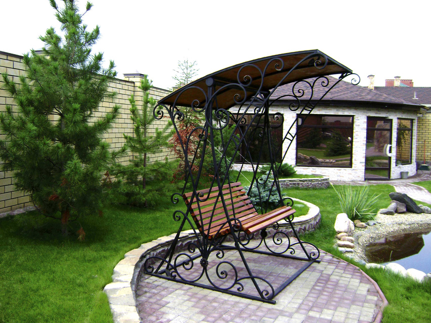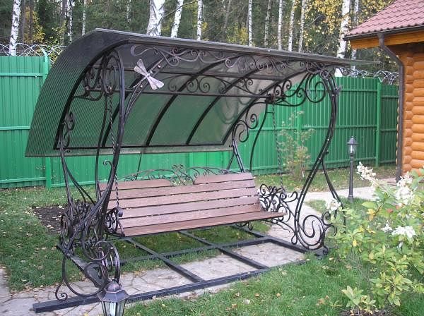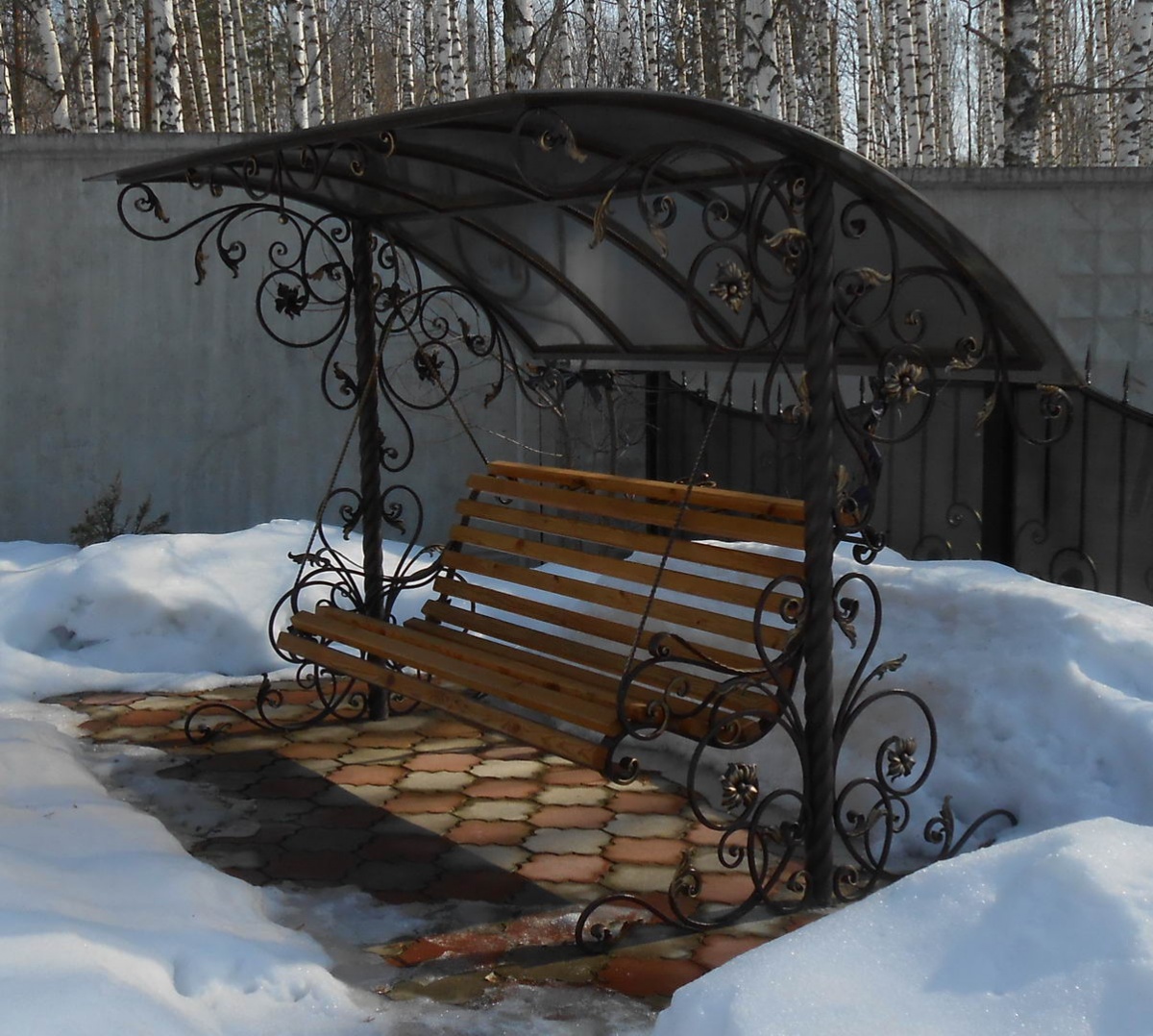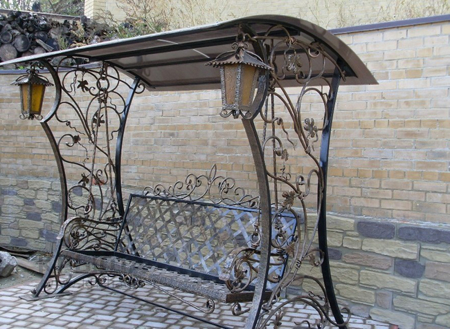 Стильная и долговечная конструкция с навесной подвижной многоместной скамьей в настиле из ромбической решетки. Под полукруглым навесом из тонированного поликарбоната установлены два подвесных уличных фонаря в викторианском стиле. Фигурные боковины украшают плетистые растительные узоры из кованого металла. Кованые качели требуют жесткого крепления к ровному фундаменту.