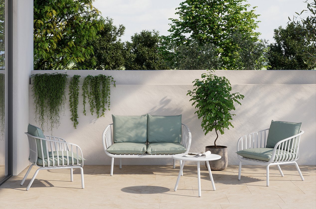 В наборе: диван трехместный, 2 кресла, стол. Материал: массив сосны с влагоустойчивым лаком.