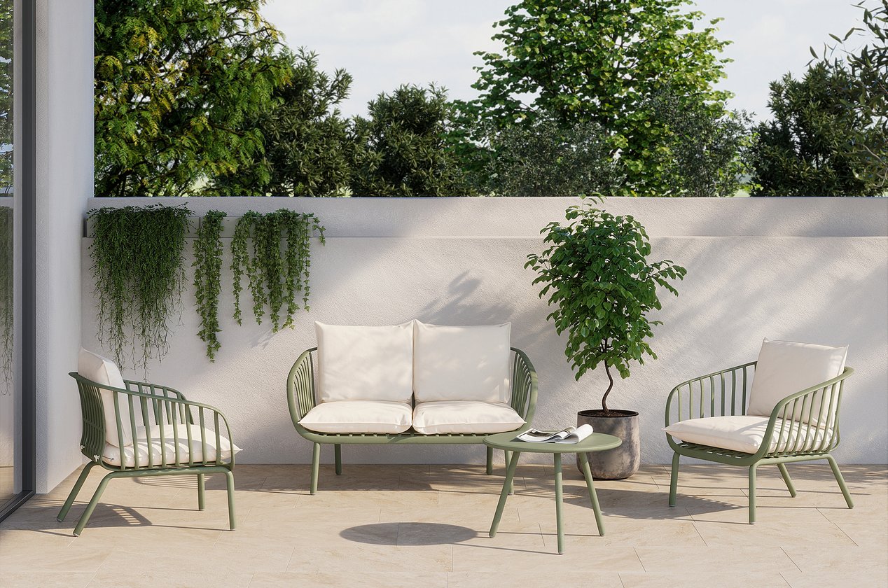 В комплекте: диван, кресло 2шт., журнальный стол. Материал: металл.